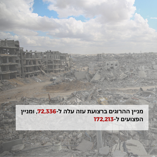 מניין ההרוגים ברצועת עזה עלה ל-72,336, ומניין הפצועים ל-172,213.