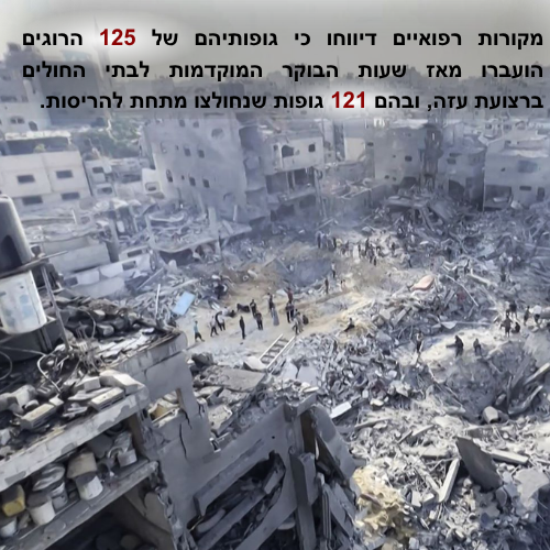 מאז שעות הבוקר: ארבעה הרוגים ו-121 גופות נוספות חולצו ברצועת עזה