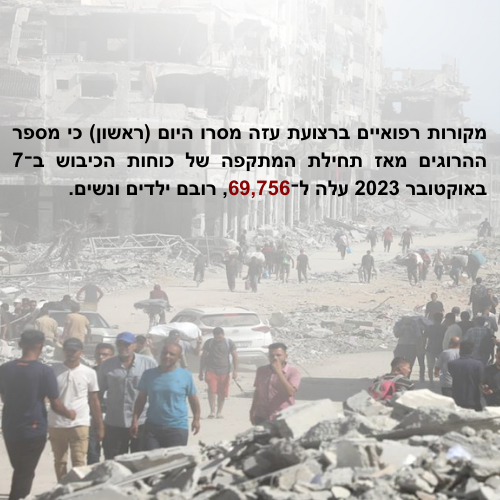 מניין ההרוגים בעזה מאז תחילת המתקפה עלה ל־69,756 ו־170,946 פצועים