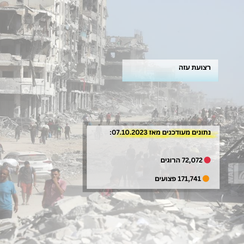 עלייה במספר ההרוגים ברצועת עזה ל-72,072 ובמספר הפצועים ל-171,741 מאז תחילת המלחמה.