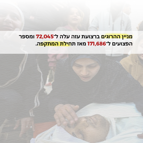 מניין ההרוגים ברצועת עזה עלה ל־72,045 ומספר הפצועים ל־171,686 מאז תחילת המתקפה.