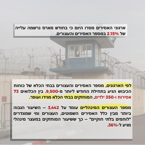 9,500 עצורים ואסירים בבתי הכלא של כוחות הכיבוש, בהם 73 אסירות ו-350 ילדים.