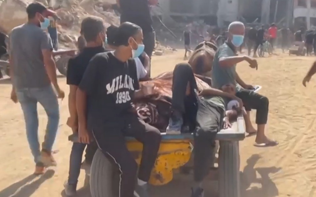 פצועים פונו לבית החולים אל-אקצא בעקבות ההפצצה הישראלית על שוק בדיר אל-בלח שבמרכז רצועת עזה.
