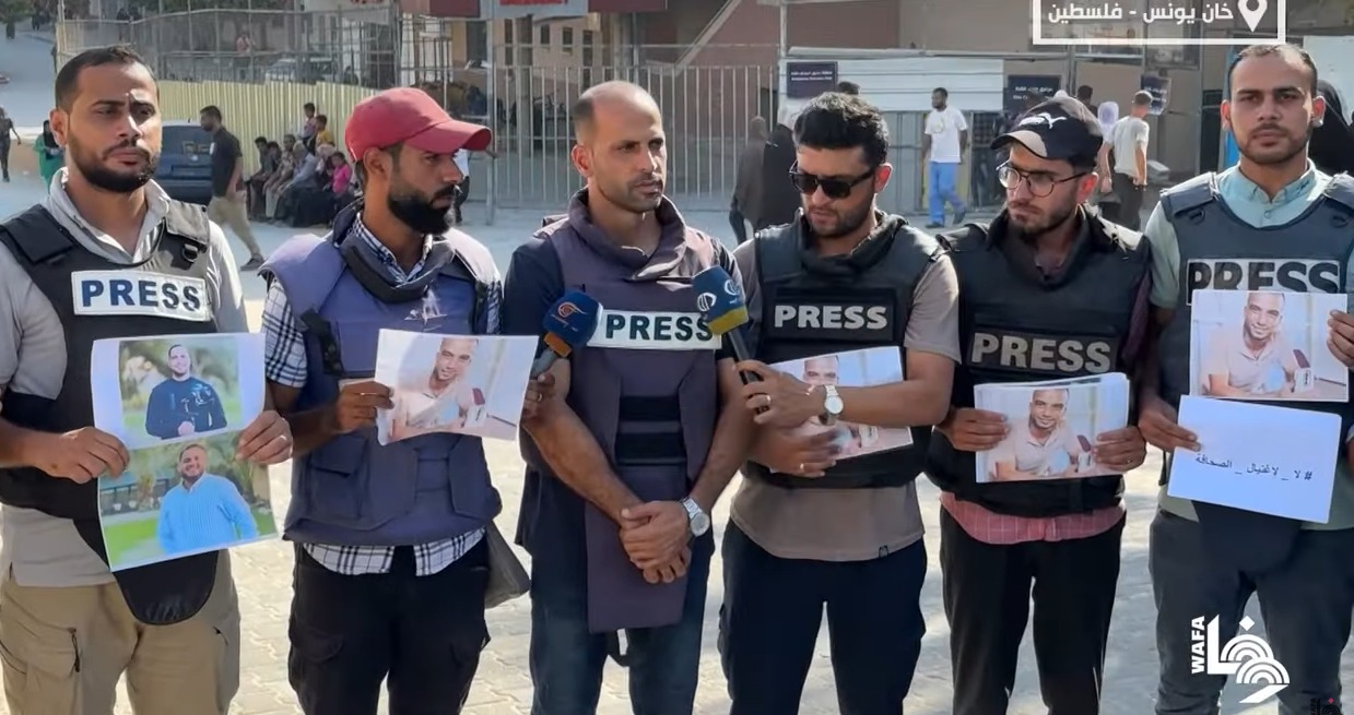 עיתונאים פלסטינים מפגינים מול בית החולים נאצר בח'אן יונס